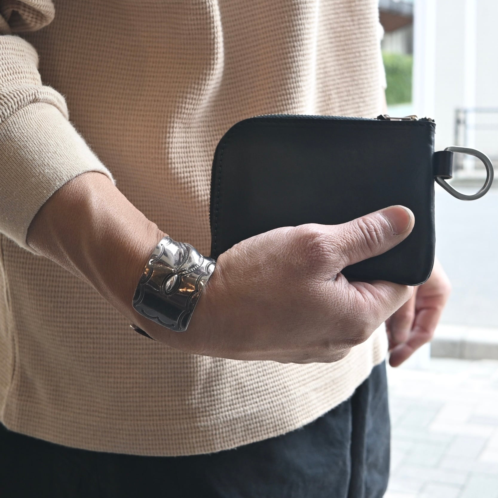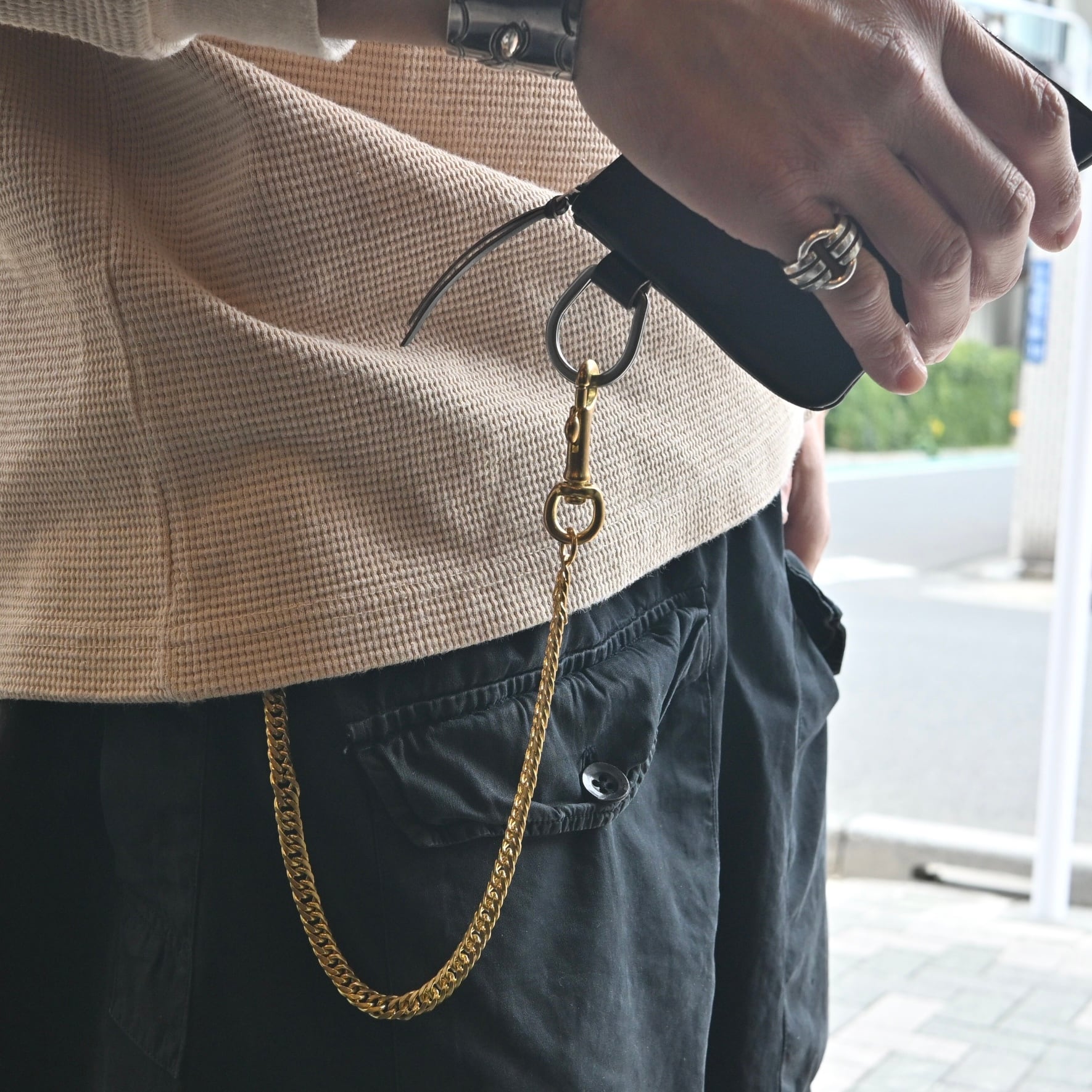 ウォレットチェーンや鍵が付けられるBWホーズシューリング付き。
